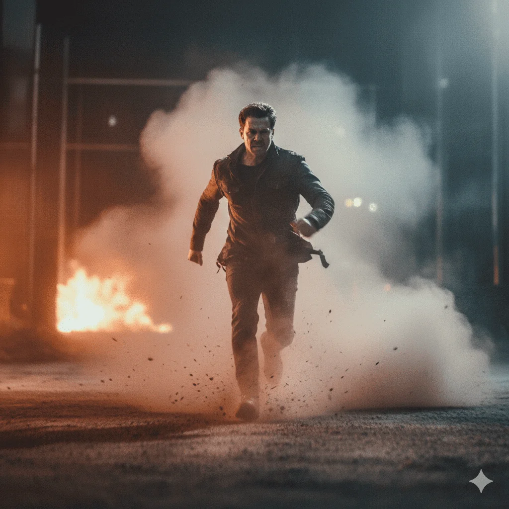 Prompt: Ultra-realistic 4K portrait of as the reference image, with the same face, same identity, and no facial changes, captured while running through thick dust and smoke, with an intense facial expression and powerful forward motion. The subject is an adult character, wearing cinematic action-style clothing with realistic fabric textures. Dramatic, high-contrast lighting cuts through the smoke, creating strong highlights and deep shadows, while a wide-angle lens perspective and dynamic motion blur enhance the sense of speed and urgency. The environment is an epic cinematic scene filled with dust, smoke, and atmospheric depth, enhanced by cinematic color grading, ultra-detailed realistic textures, and a professional movie-still photography style with intense realism.