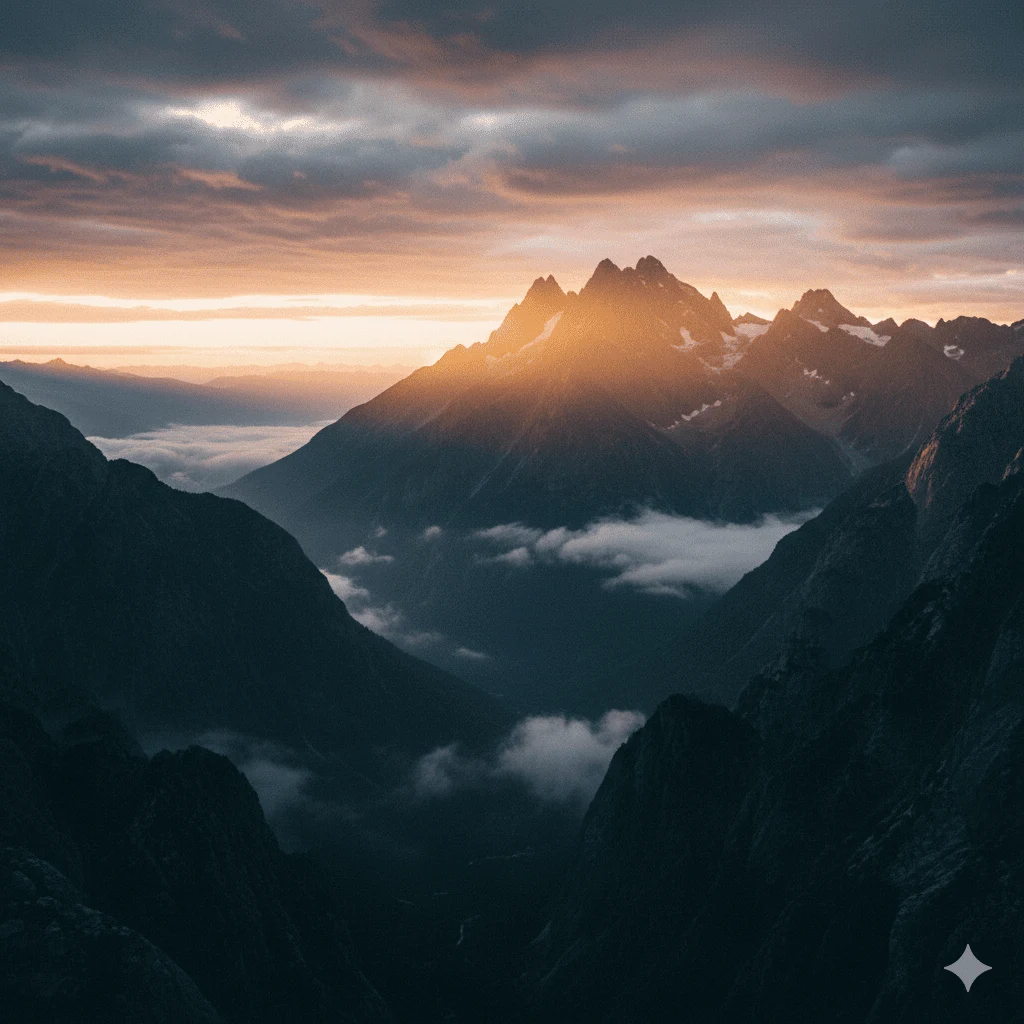 Prompt: Ultra-realistic 4K cinematic wide landscape shot of towering mountains at sunrise, with soft mist floating through the valleys and dramatic clouds stretching across the sky, creating an epic sense of scale. Cinematic sunrise lighting blends warm golden tones with cool blue shadows, producing striking color contrast and atmospheric depth. The environment features a breathtaking mountain landscape with layered peaks, drifting fog, and vast open space, captured with a wide-angle cinematic perspective. Ultra-realistic textures in rock formations and clouds, subtle film grain, balanced highlights and shadows, and film photography–style cinematic color grading, resulting in a powerful movie-background–quality scene with immersive realism.