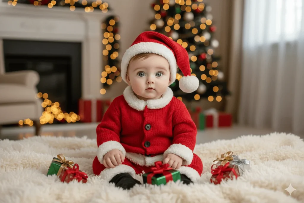 Ultra-realistic 4K portrait of the SAME PERSON as the reference image, same face, same identity, no facial changes, sitting on a fluffy blanket with tiny Christmas gifts around, wearing a red knitted Santa suit and hat, soft warm fairy lights, cozy living room with decorated Christmas tree, realistic skin texture, professional photography style.