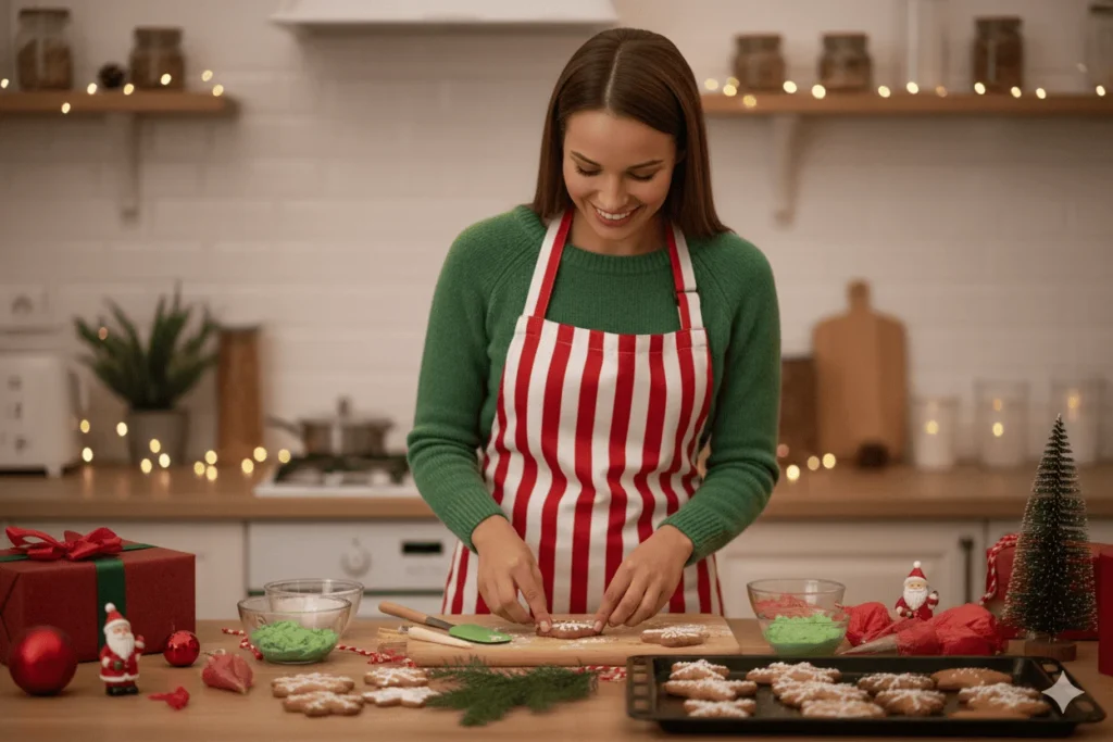 Ultra-realistic 4K portrait of the SAME PERSON as the reference image, same face, same identity, no facial changes, decorating Christmas cookies in the kitchen, wearing festive apron with red and white stripes, soft natural kitchen lighting, kitchen counter with baking utensils, cookie trays, and Christmas decorations, realistic skin texture, professional photography style.