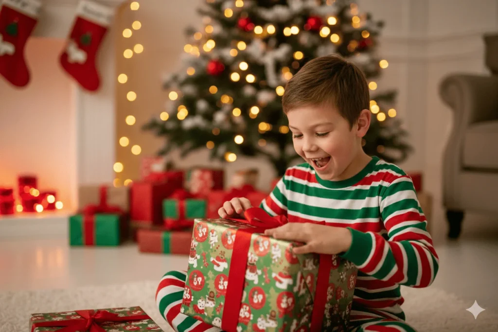 Ultra-realistic 4K portrait of the SAME PERSON as the reference image, same face, same identity, no facial changes, opening a Christmas gift with excitement, wearing cozy red and green pajamas, warm indoor lighting, living room with tree, gifts, and holiday decor, realistic skin texture, professional photography style.