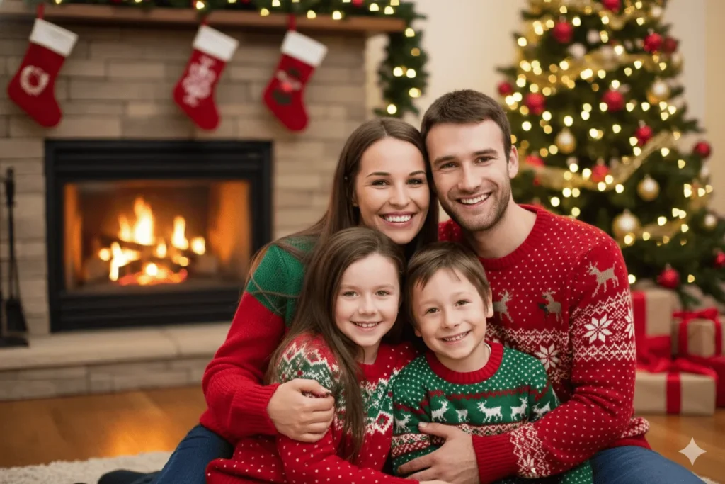 Ultra-realistic 4K portrait of the SAME PERSON as the reference image, same face, same identity, no facial changes, family hugging by the fireplace, smiling at the camera, wearing matching red and green Christmas sweaters, soft indoor warm lighting, living room decorated with garlands and stockings, realistic skin texture, professional photography style.