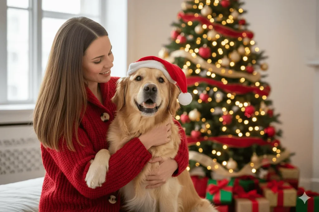 Ultra-realistic 4K portrait of the SAME PERSON as the reference image, same face, same identity, no facial changes, holding a Golden Retriever wearing a Santa hat, wearing a cozy red cardigan, soft natural window light, living room with decorated Christmas tree and wrapped gifts, realistic skin texture, professional photography style.