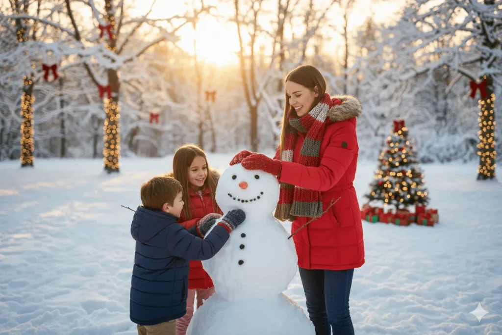 Ultra-realistic 4K portrait of the SAME PERSON as the reference image, same face, same identity, no facial changes, building a snowman with children in the snow, wearing a red parka with a knitted scarf and gloves, golden sunset lighting, snow-covered park with decorated trees and fairy lights, realistic skin texture, professional photography style.
