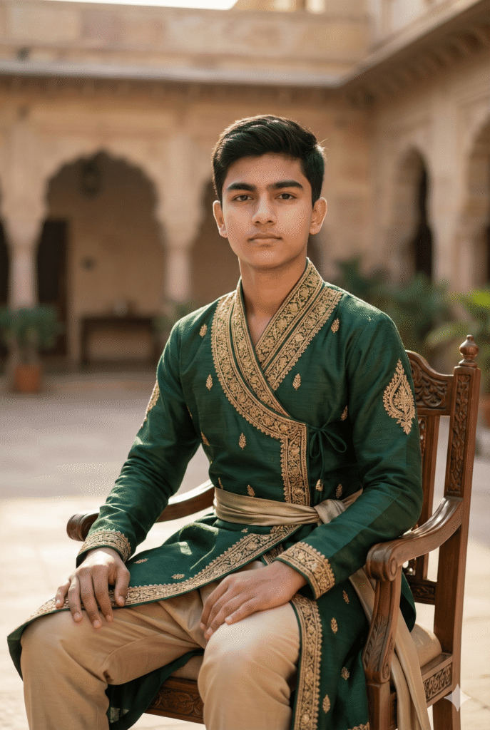 OUTFIT: Angarkha Style Outfit in royal color: Hunter Green + Beige. Premium quality fabric, sharp tailoring, natural folds. Accessories: stylish shoes, optional accessories (watch/hat/sunglasses), minimal jewelry if any.