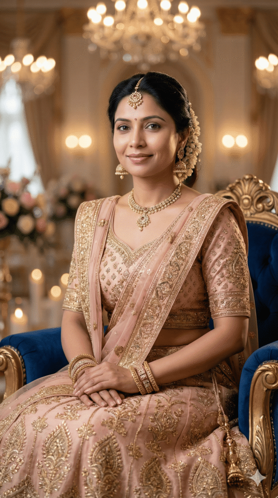 POSE: sitting gracefully on royal chair/floor, hands folded, elegant smile. BACKGROUND: Luxury Wedding Hall, chandeliers, elegant, soft cinematic natural light, gentle rim lighting, shallow depth of field, subtle bokeh.