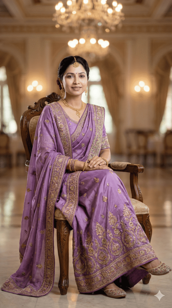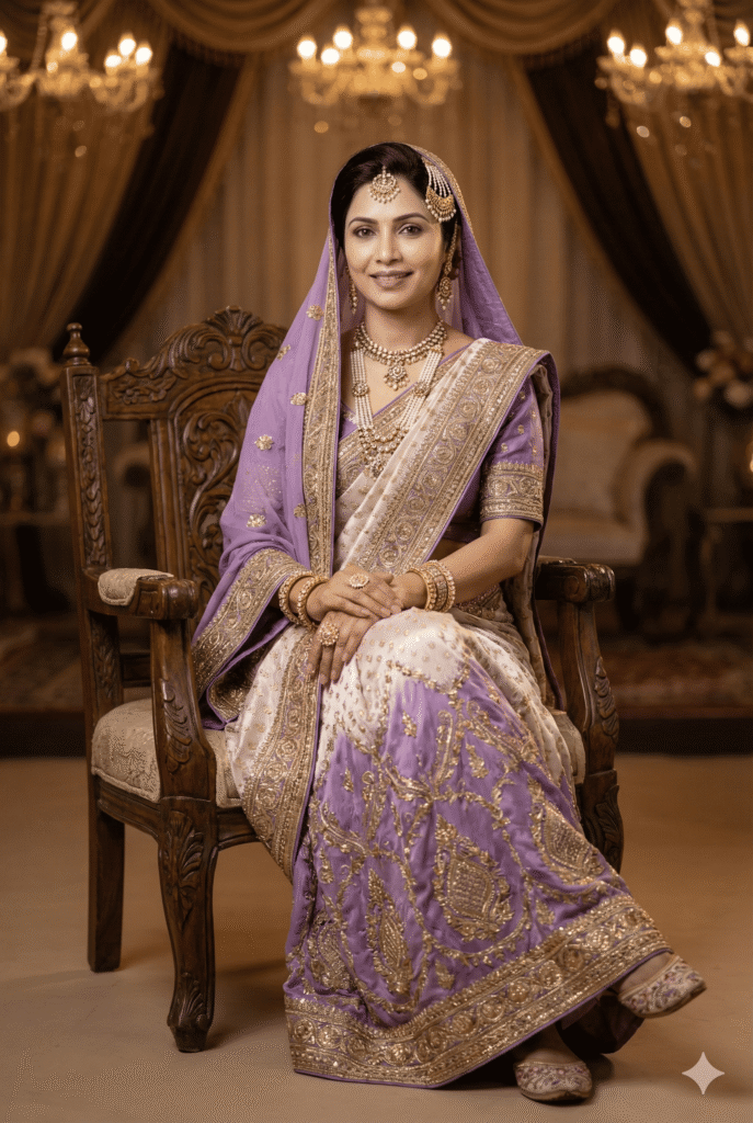 OUTFIT: Panetar Saree in royal color: Lavender + Pearl. Premium quality fabric, intricate embroidery, royal rajasthani detailing. Accessories: traditional jewelry (earrings, necklace, bangles), embroidered footwear, matching dupatta.
