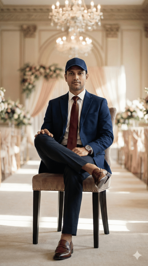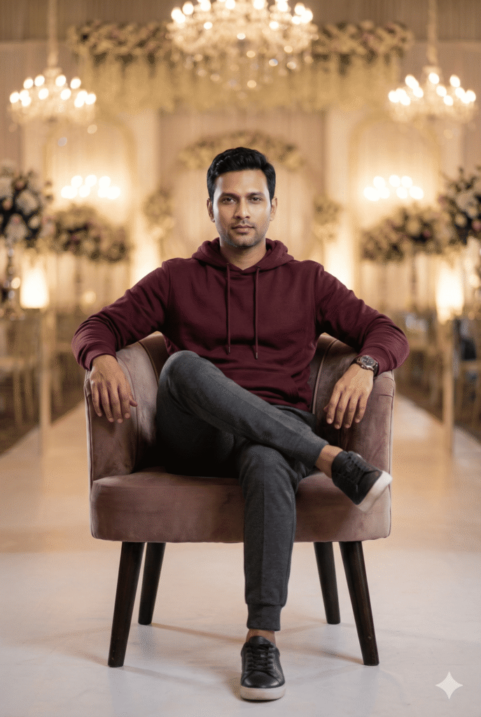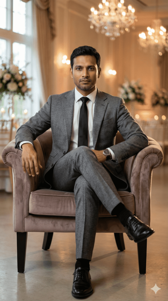 POSE: sitting confidently on chair/sofa, legs crossed, natural expression. BACKGROUND: Luxury Wedding Hall, chandeliers, elegant, soft cinematic natural light, gentle rim lighting, shallow depth of field, subtle bokeh.