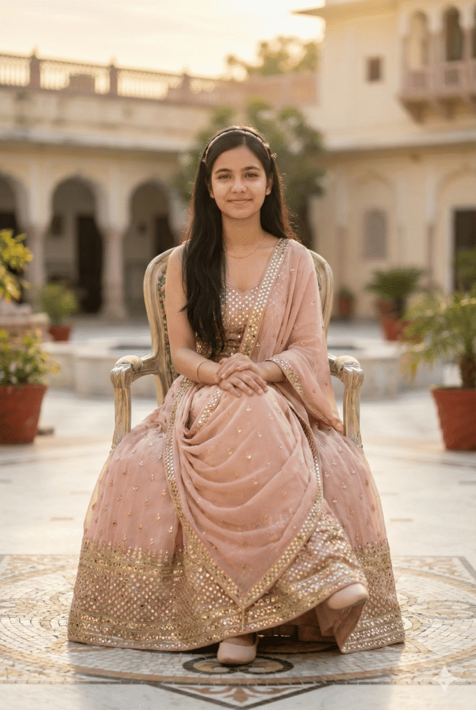 OUTFIT: Rajasthani Posaak Suit (Royal embroidery, heavy zari) in royal color: Deep Pink + Gold. Premium quality fabric, intricate embroidery, royal rajasthani detailing. Accessories: traditional jewelry (earrings, necklace, bangles), embroidered footwear, matching dupatta.