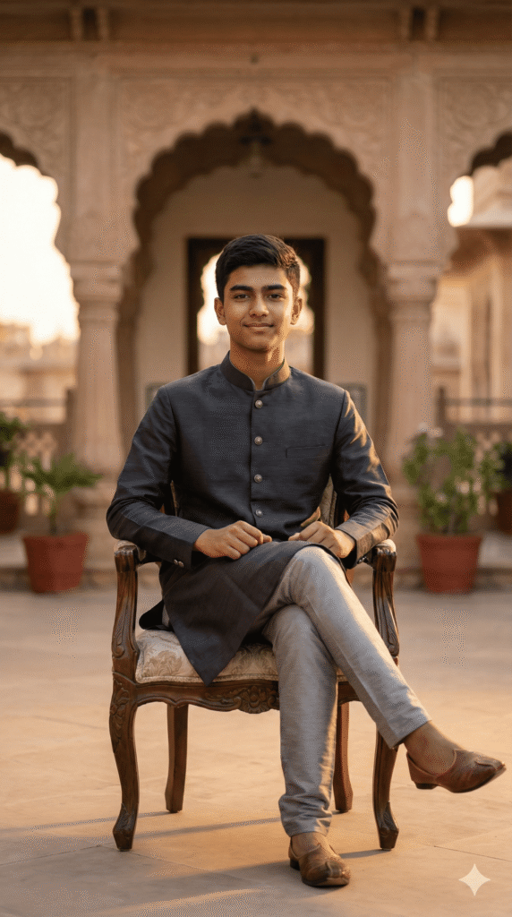 OUTFIT: Long Jacket Kurta Set in royal color: Charcoal + Light Grey. Premium quality fabric, sharp tailoring, natural folds. Accessories: stylish shoes, optional accessories (watch/hat/sunglasses), minimal jewelry if any.