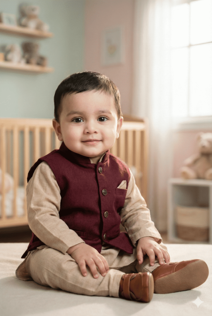 BABY OUTFIT: Ethnic Mini Waistcoat + Kurta in adorable Burgundy + Beige color theme. Soft, breathable baby-friendly fabric, comfortable fit for 0-5 years.