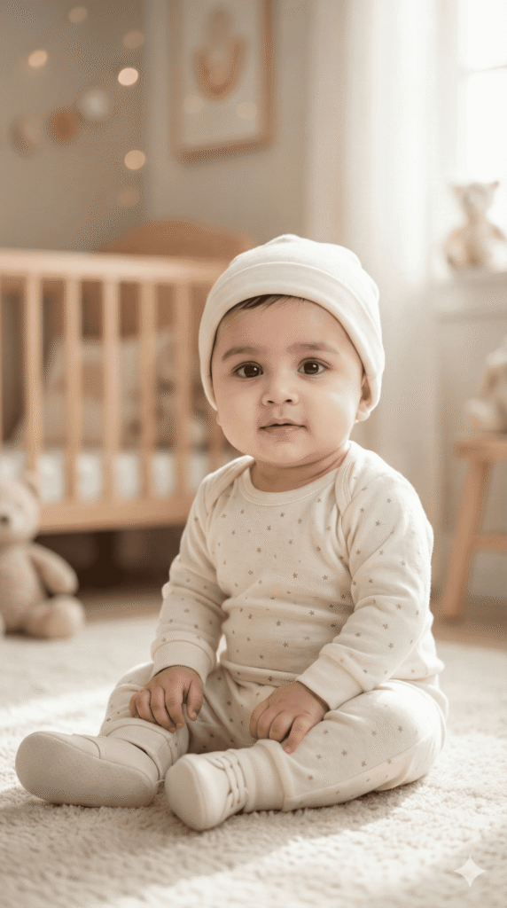 BABY POSE: sitting cutely on floor/chair, looking at camera with baby smile. BACKGROUND: Nursery Room, soft colors, baby furniture, soft natural lighting, gentle rim lighting, shallow depth of field, subtle bokeh.