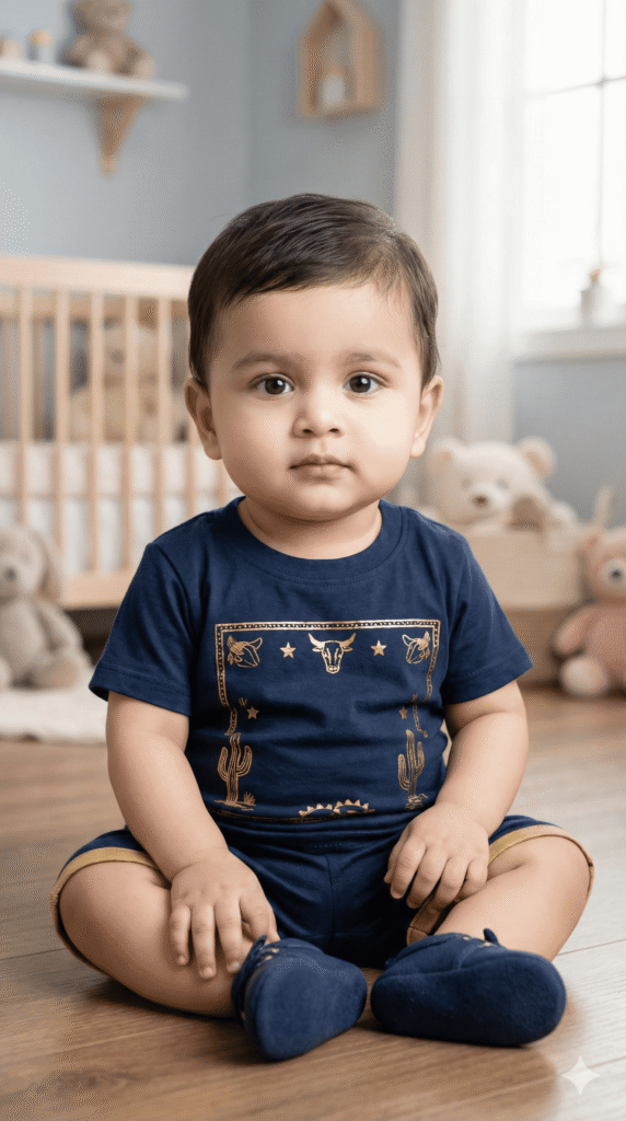 BABY OUTFIT: Western T-shirt + Shorts in adorable Navy Blue + Gold color theme. Soft, breathable baby-friendly fabric, comfortable fit for 0-5 years.