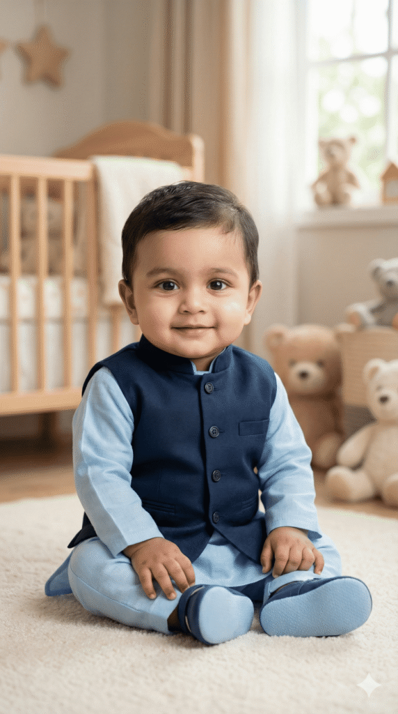 BABY OUTFIT: Ethnic Mini Waistcoat + Kurta in adorable Navy + Baby Blue color theme. Soft, breathable baby-friendly fabric, comfortable fit for 0-5 years.