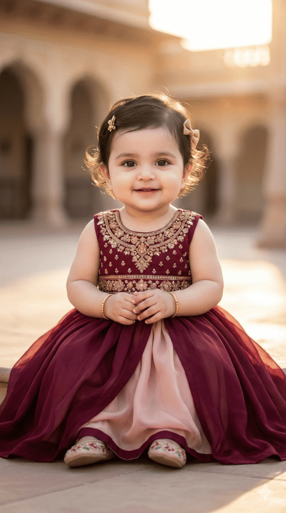 OUTFIT: Embellished Maxi Dress in royal color: Burgundy + Blush. Premium soft flowing fabric, natural baby folds. Accessories: tiny embroidered shoes, hair accessories (bow/clips), minimal jewelry optional.