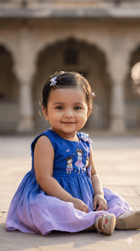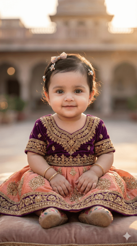 OUTFIT: Velvet Lehenga in royal color: Peach + Purple. Premium soft flowing fabric, natural baby folds. Accessories: tiny embroidered shoes, hair accessories (bow/clips), minimal jewelry optional.
