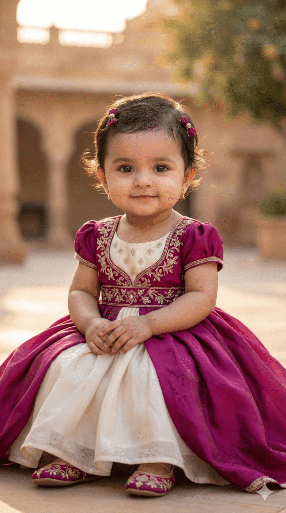 OUTFIT: Princess Gown in royal color: Magenta + Ivory. Premium soft flowing fabric, natural baby folds. Accessories: tiny embroidered shoes, hair accessories (bow/clips), minimal jewelry optional.