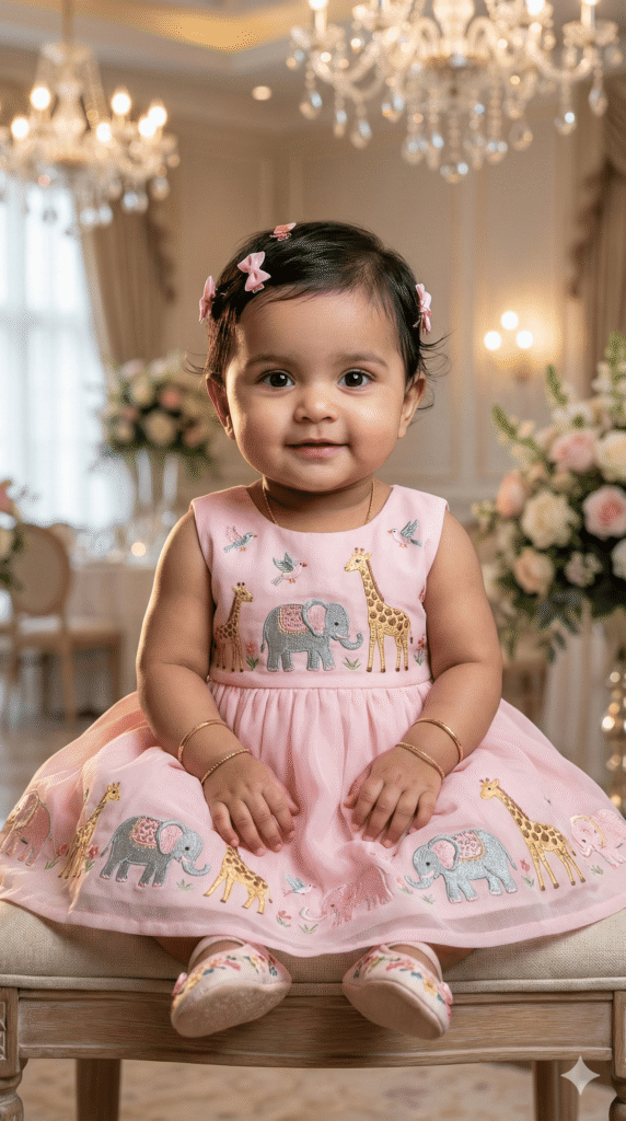 OUTFIT: Animal Themed Dress in royal color: Baby Pink. Premium soft flowing fabric, natural baby folds. Accessories: tiny embroidered shoes, hair accessories (bow/clips), minimal jewelry optional.
