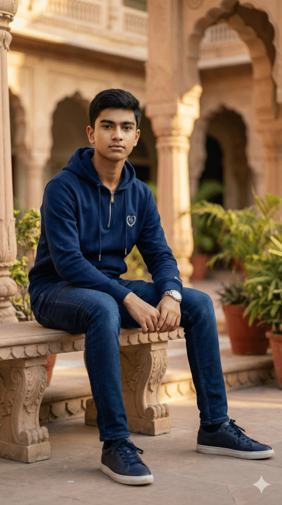 OUTFIT: Hoodie + Jeans (Winter) in royal color: Navy + Silver. Premium quality fabric, sharp tailoring, natural folds. Accessories: stylish shoes, optional accessories (watch/hat/sunglasses), minimal jewelry if any.