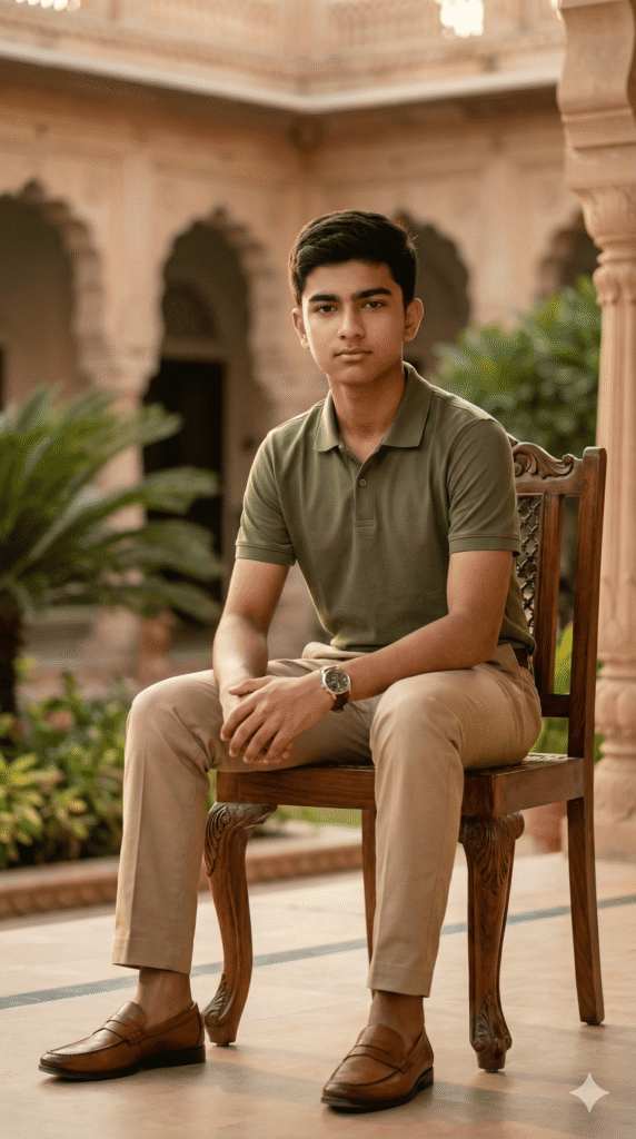POSE: sitting confidently on chair/floor, natural smile. BACKGROUND: Palace Courtyard, golden hour light, soft cinematic natural light, gentle rim lighting, shallow depth of field, subtle bokeh.