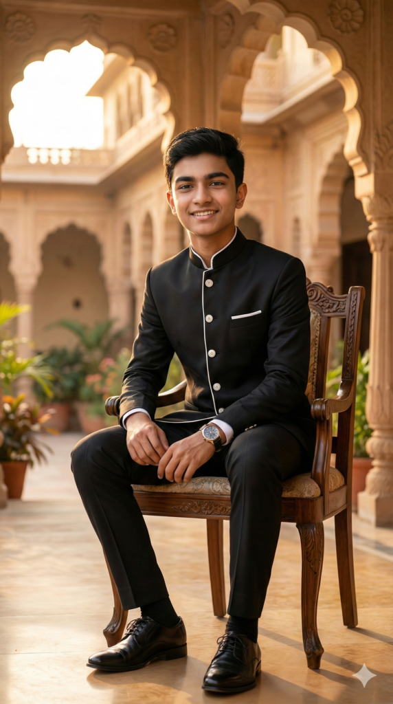 OUTFIT: Designer Jodhpuri in royal color: Black + White. Premium quality fabric, sharp tailoring, natural folds. Accessories: stylish shoes, optional accessories (watch/hat/sunglasses), minimal jewelry if any.