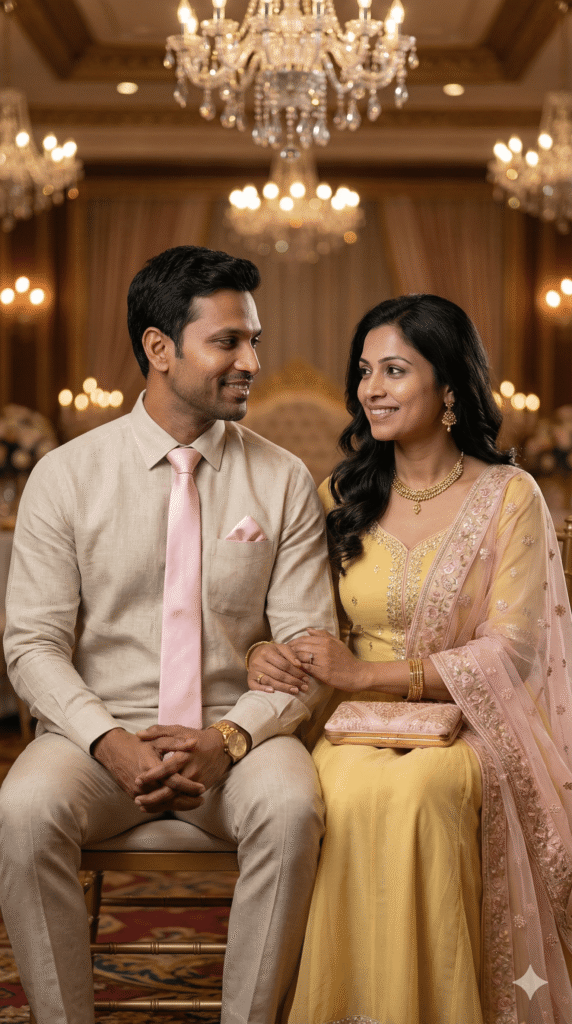 Accessories: coordinated accessories: his watch/tie/pocket square, her jewelry/clutch/dupatta, matching footwear.