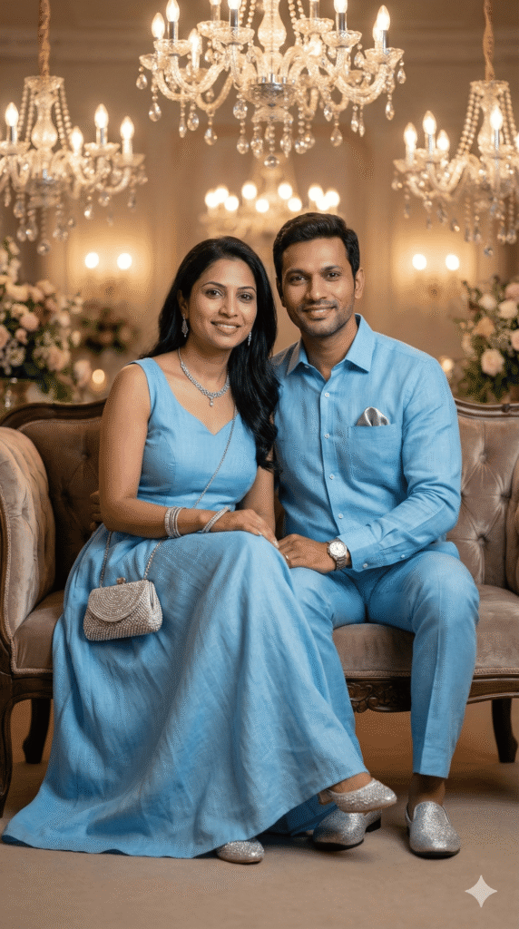 COUPLE OUTFIT: Matching: Sky Blue Linen Shirt + Pants + Sky Blue Maxi Dress (Summer Casual Coordination) in Blue + Silver theme. Premium quality fabrics, Matching Coordinated styling, perfect coordination.
