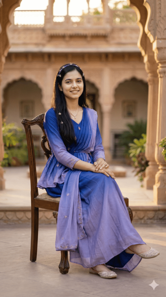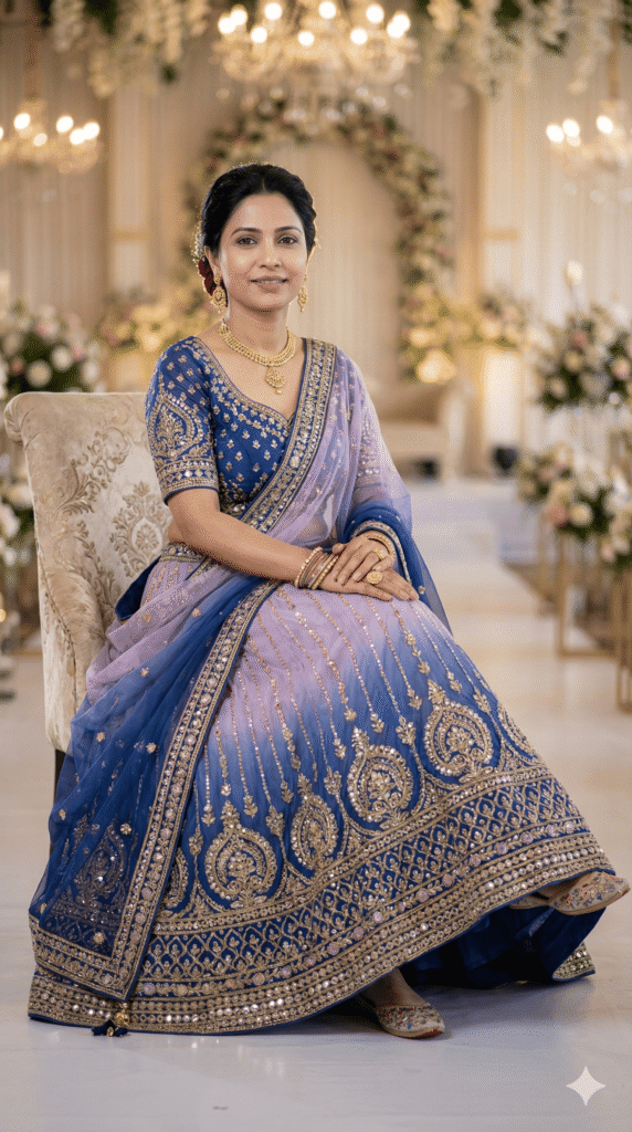 OUTFIT: Lehenga Choli (Party Wear, Tulle) in royal color: Blue to Lavender Ombre. Premium quality fabric, intricate embroidery, royal rajasthani detailing. Accessories: traditional jewelry (earrings, necklace, bangles), embroidered footwear, matching dupatta.