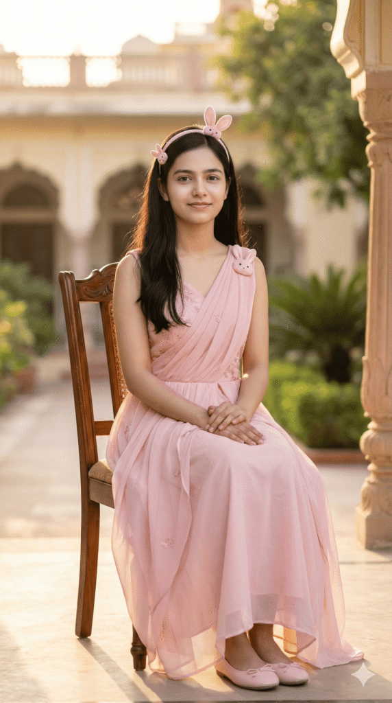 POSE: sitting gracefully on chair/floor, hands folded, natural smile. BACKGROUND: Palace Courtyard, golden hour light, soft cinematic natural light, gentle rim lighting, shallow depth of field, subtle bokeh.