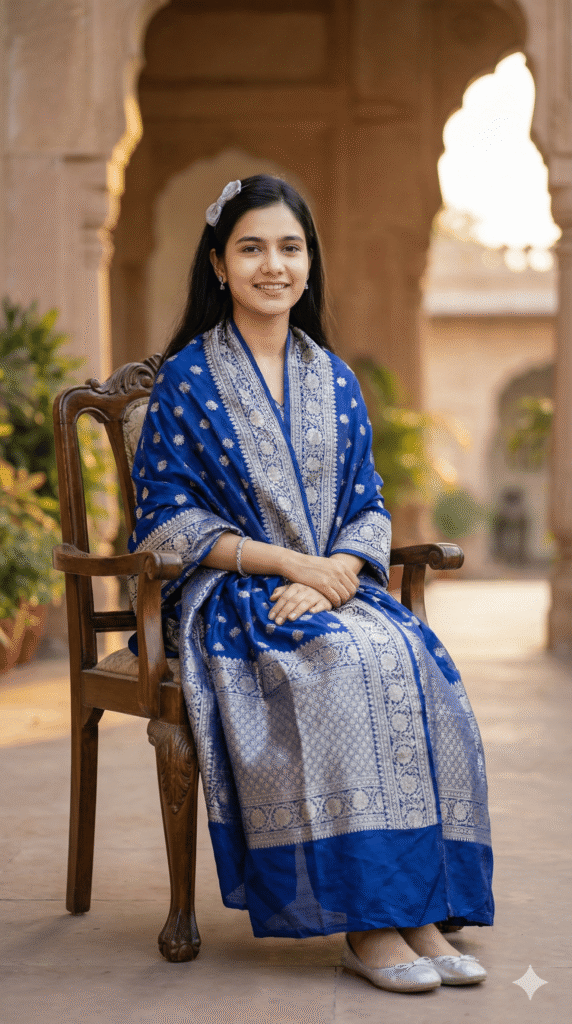 OUTFIT: Dupatta / Cape / Shawl in royal color: Blue + Silver. Premium quality fabric, elegant draping, beautiful details. Accessories: tiny shoes/ballet flats, hair accessories (bow/clips/headband), minimal jewelry optional.