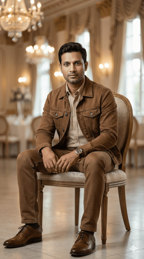 OUTFIT: Denim Jacket + Shirt + Pants in premium color: Brown + Sand. High-quality fabric, sharp tailoring, perfect fit. Accessories: stylish shoes (oxfords/loafers/sneakers), watch, minimal accessories.