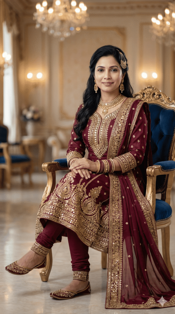 OUTFIT: Hoodie Dress + Leggings in royal color: Burgundy + Pearl. Premium quality fabric, intricate embroidery, royal rajasthani detailing. Accessories: traditional jewelry (earrings, necklace, bangles), embroidered footwear, matching dupatta.