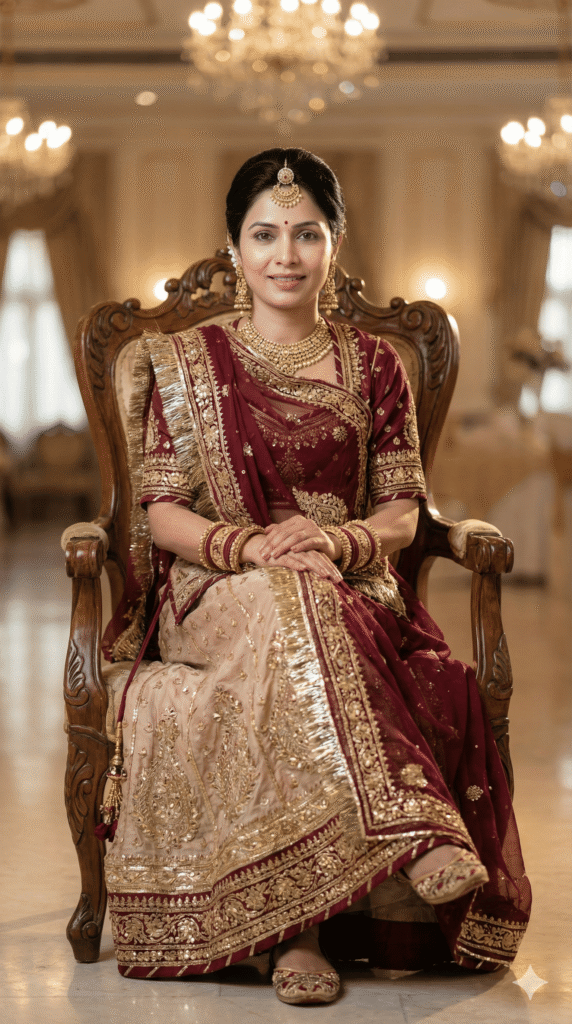 OUTFIT: Bandhani Saree (Rajasthani Print) in royal color: Maroon + Beige. Premium quality fabric, intricate embroidery, royal rajasthani detailing. Accessories: traditional jewelry (earrings, necklace, bangles), embroidered footwear, matching dupatta.