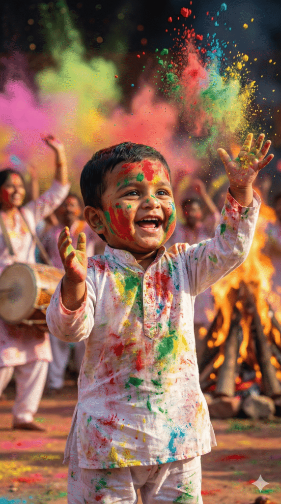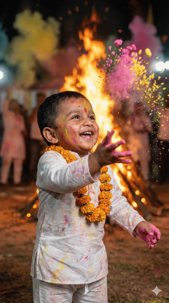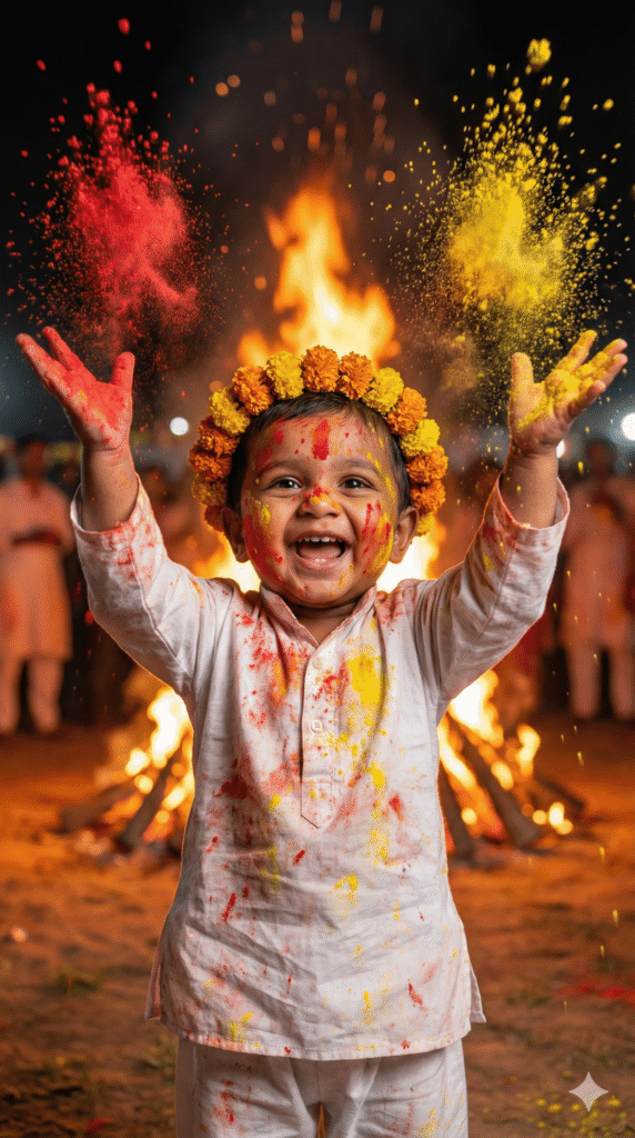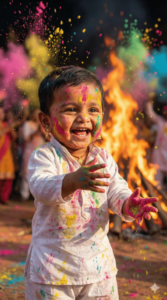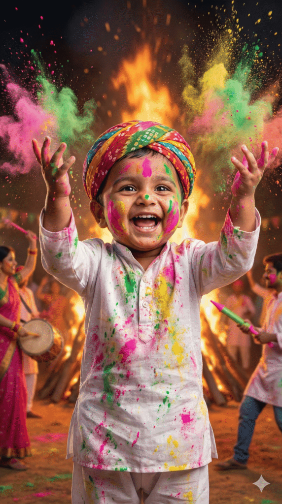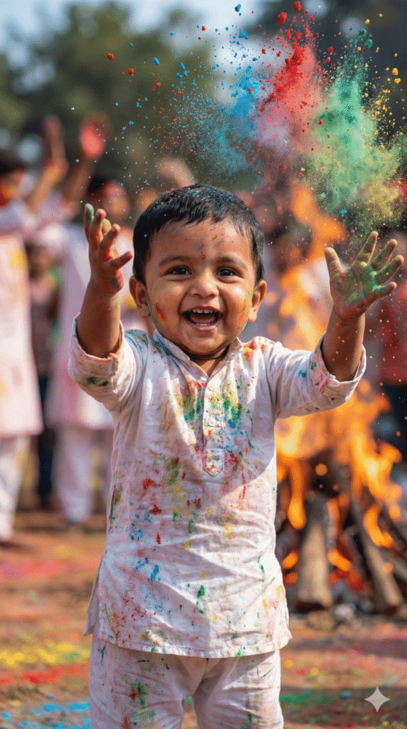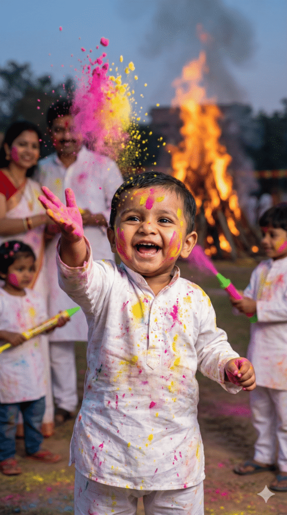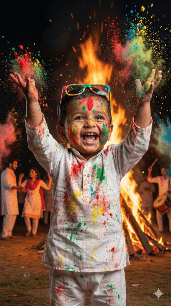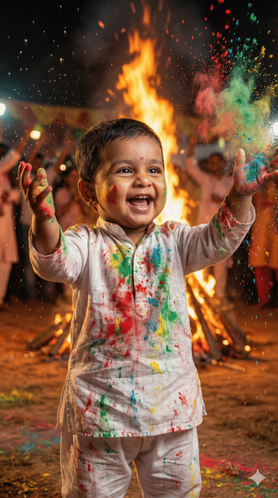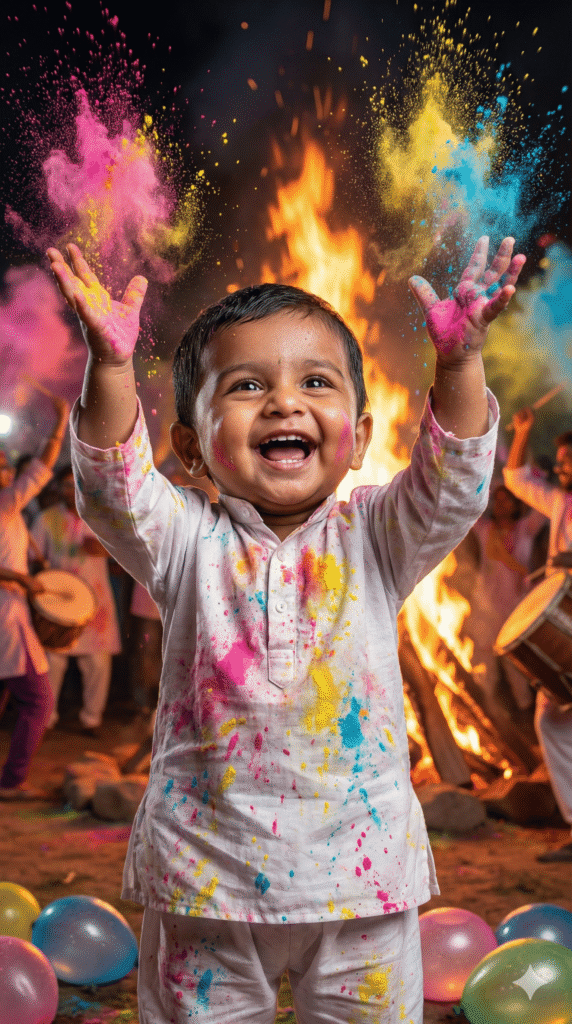 Ultra-realistic cinematic Holi festival portrait of a baby boy with a joyful mood. Scene shows Throwing colorful gulal in air, laughing joyfully, hands raised, colorful powder exploding — throwing colorful gulal, dancing, drumming, holding pichkaris, interacting with a couple, or group celebration. Background features Holika bonfire at night - Large bonfire, flames rising, people gathered, warm glow, festive atmosphere, softly depth-blurred with vibrant Holi colors exploding in mid-air, powder and water droplets visible, dynamic and playful.