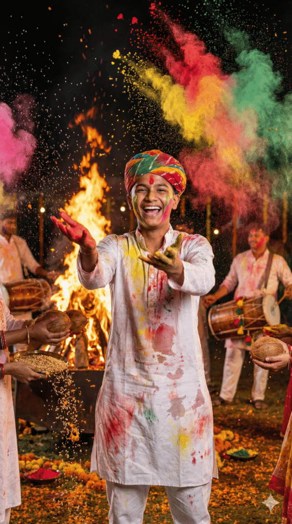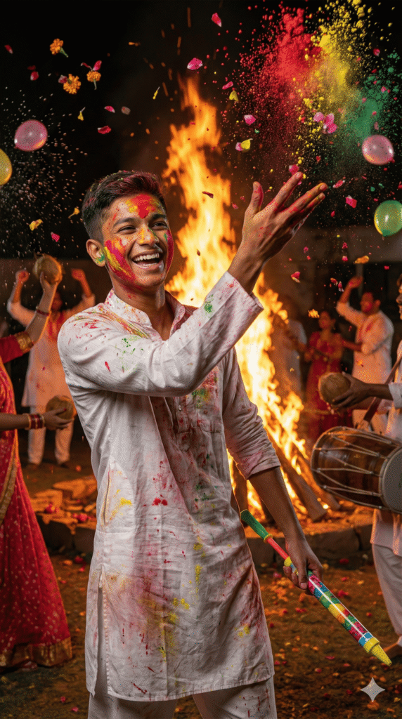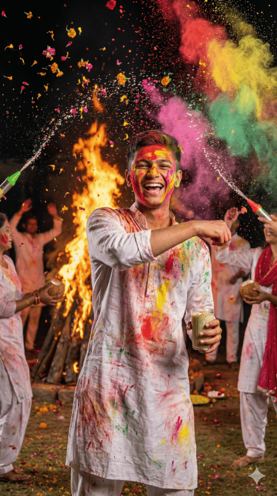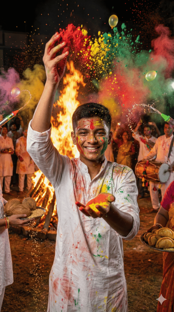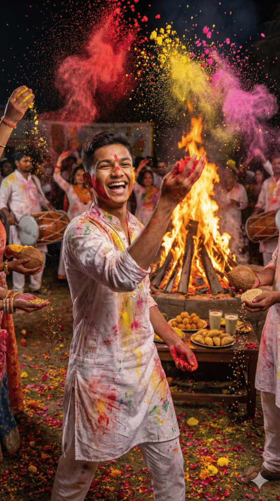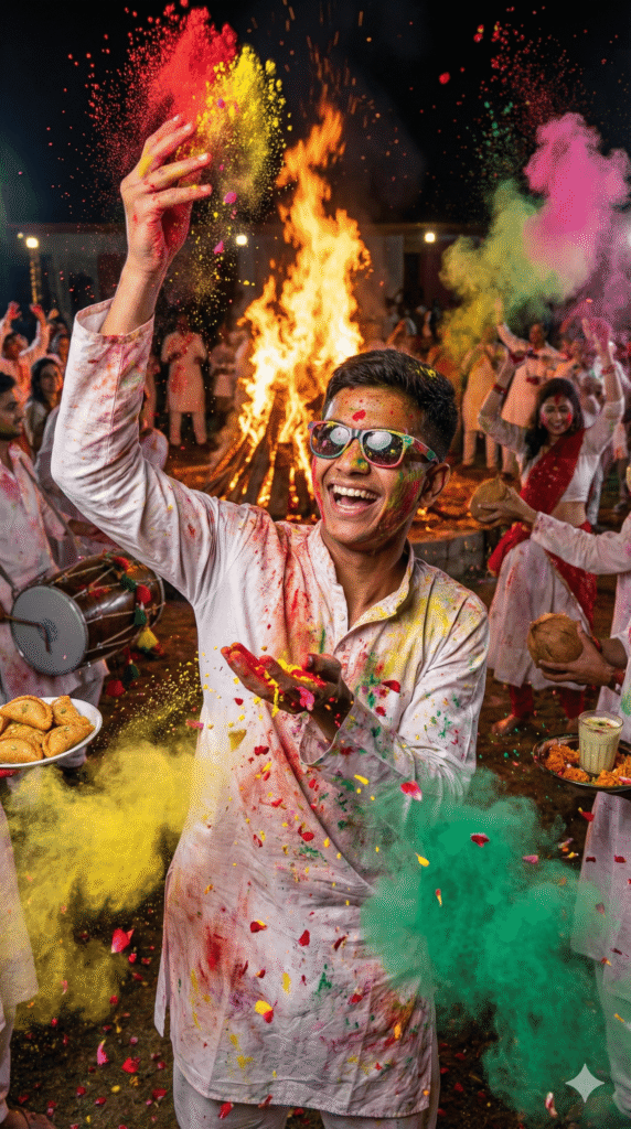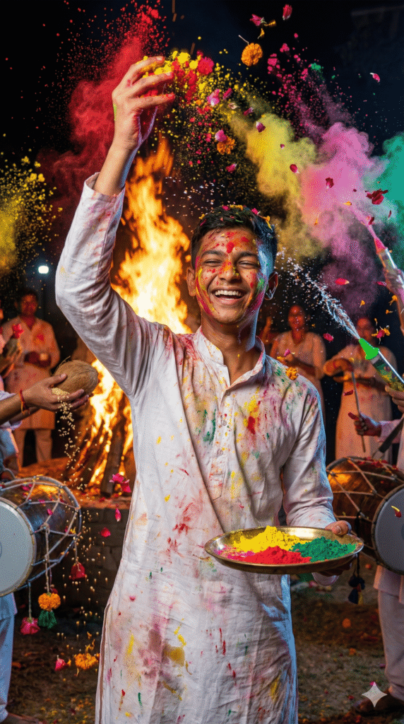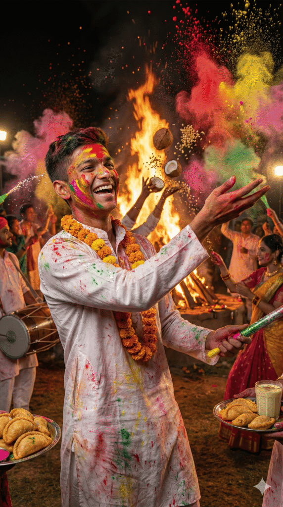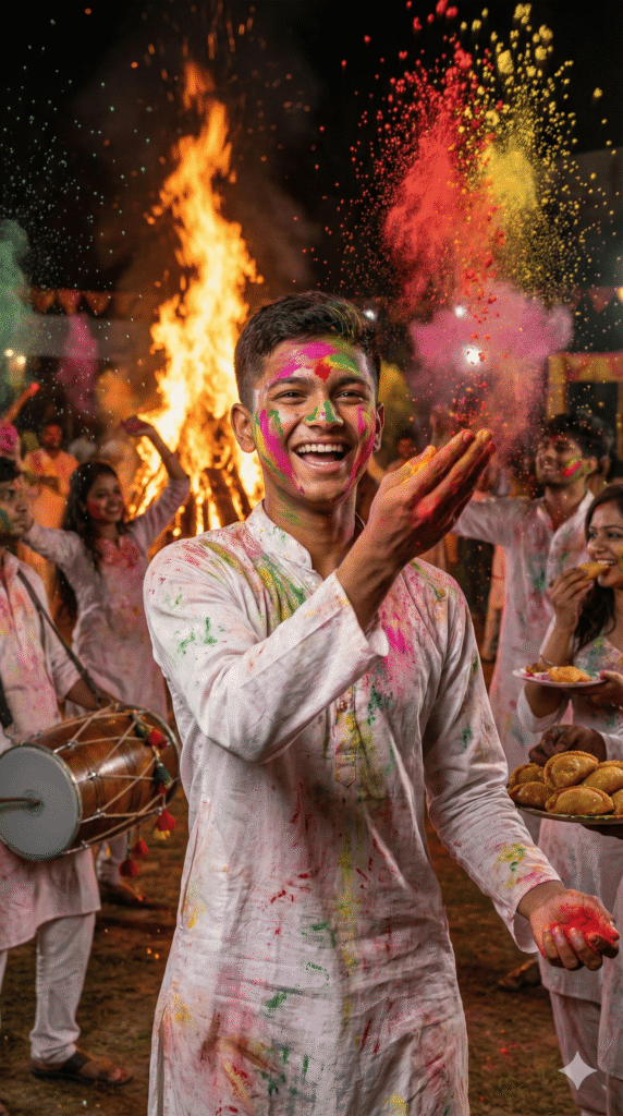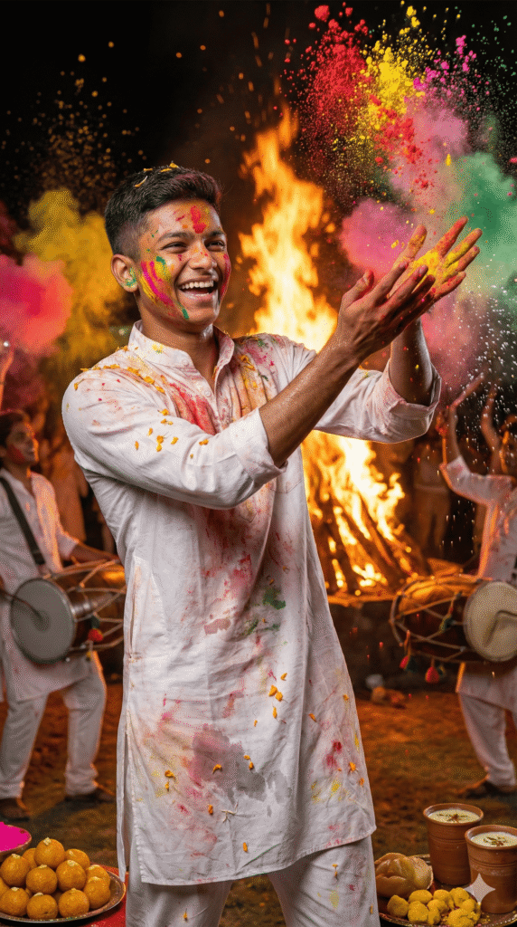 Background features Holika bonfire at night - Flames rising, people gathered, offering coconut and grains with colorful powder explosions. Outfit includes White kurta pajama with multicolor gulal with realistic fabric texture, splashed with gulal stains and wet patches. Traditional elements include dhol music, Holi songs, and folk dances. Sweets like gujiya and thandai being enjoyed.
