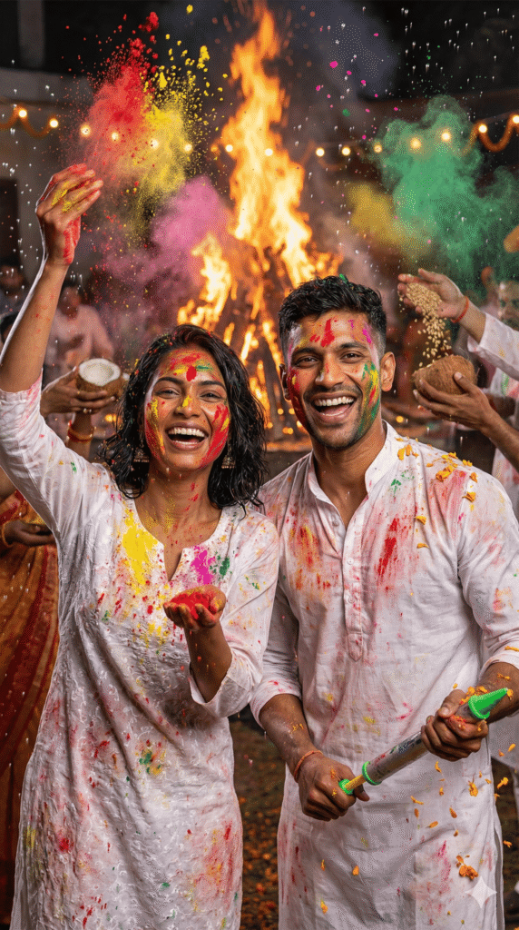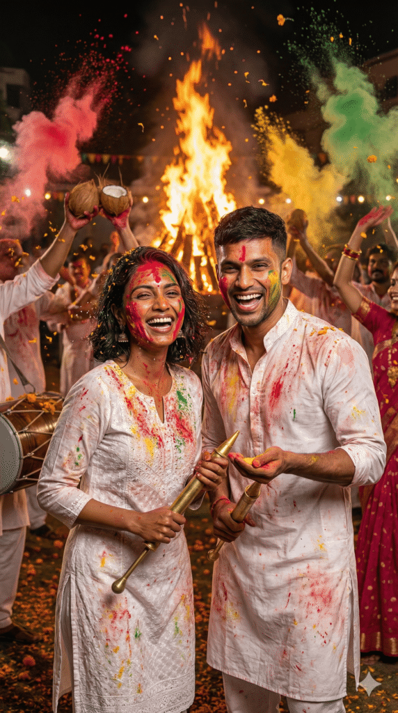 Background features Holika bonfire at night - Flames rising, people gathered, offering coconut and grains with colorful powder explosions. Outfit includes Matching white ethnic set with colors with realistic fabric texture, splashed with gulal stains and wet patches. Traditional elements include dhol music, Holi songs, and folk dances. Sweets like gujiya and thandai being enjoyed.